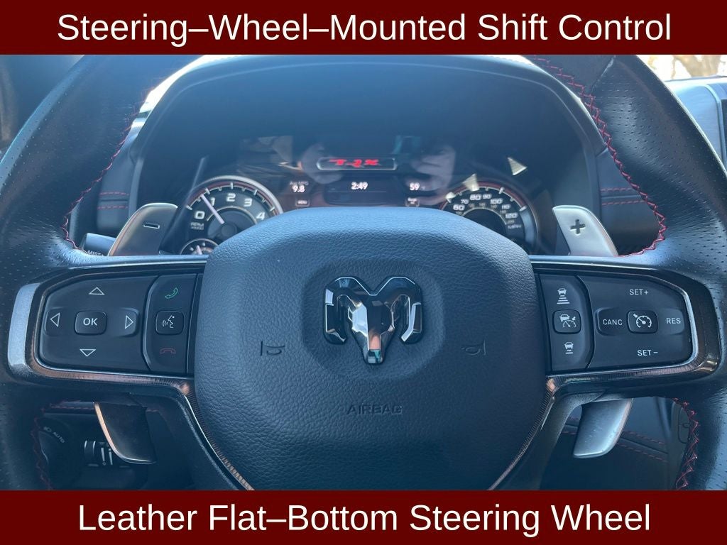 2022 Ram 1500 TRX in Bright White Clearcoat vehicle highlights include.., CERTIFIED READY, CLEAN CAR FAX, ACCIDENT FREE, 4WD, DUAL PANE PANORAMIC SUNROOF, BLIS W/CROSS-PATH PROTECTION, PARKSENSE FRONT & REAR PARK ASSIST, PARKVIEW BACK UP CAMERA, DIGITAL REAR-VIEW MIRROR, FULL SPEED FORWARD COLLISION BRAKING, PEDESTRIAN WARNING, ADVANCED BRAKE ASSIST, H.U.D. HEADS UP DISPLAY, LANE KEEPING, REMOTE START, INTELLIGENT ACCESS W/PUSH BUTTON START, REMOTE KEYLESS ENTRY, ILLUMINATED ENTRY, AUTOMATIC, FLAT BOTTOM SPORT STEERING WHEEL, HEATED STEERING WHEEL, POWERED ADJUSTABLE PEDALS w/MEMORY, RAIN SENSING WIPERS, PADDLE SHIFTER, CONFIGURABLE DRIVE MODES, DUAL WIRELESS CHARGING STATION, 5G WIFI MODEM, WIFI HOT SPOT, HD RADIO, Bluetooth®, AUXILLARY INPUT, MEDIA HUB, 12. PREMIUM TOUCH SCREEN, HARMAN KARDAN PREMIUM AUDIO, CARGO TIE DOWN HOOKS BY MOPAR, DEPLOYABLE BED STEP BY MOPAR, LED AMBIENT INTERIOR LIGHTING, CLASS lV TRAILER HITCH, INTEGRATED TRAILER BRAKE, POWER SLIDING REAR WINDOW, SPRAY-IN BEDLINER BY MOPAR*, LED BED LIGHTING, POWER TAILGATE RELEASE, QUALITY, PREMIUM LEATHER TRIMMED SEATING, MEMORY DRIVER SEAT, POWER SEATS, SPORT SEATS, HEATED & COOLED FRONT SEATS, VENTILATED SEATS, HEATED 2ND ROW, VENTILATED REAR SEATS, CLEAN AIR SYSTEM, FRONT & REAR RUBBER MATS BY MOPAR, *PERFORMANCE BRAKES, 6.2L Supercharged HEMI V8 SRT, 8-Speed Automatic, #2 Seat Foam Cushion, 10 Speakers, 2-Door Passive Entry, Front Door Locks, 3.55 Rear Axle Ratio, 4 Way Front Headrests, 4-Wheel Disc Brakes, ABS brakes, Adaptive Cruise Control w/Stop & Go, Adaptive suspension, Advanced Safety Group, Alloy wheels, AM/FM radio: SiriusXM with 360L, Apple CarPlay/Android Auto, Auto High-beam Headlights, Auto-dimming door mirrors, Auto-dimming Rear-View mirror, Automatic temperature control, Bed Utility Group, Black Exterior Mirrors, Blind Spot & Cross Path Detection, Body Color Door Handles, Brake assist, Bucket Seats, Center Console Parts Module, Cloth/Vinyl Bucket Seats, Compass, Delay-off headlights, Digital Rearview Mirror, Dome Dual LED Reading Lamp, Driver door bin, Driver Seat Memory, Driver/Passenger Wrapped Assist Handles, Electronic Stability Control, Exterior Mirrors Courtesy Lamps, Exterior Mirrors w/Heating Element, Exterior Mirrors w/Memory, Exterior Mirrors w/Supplemental Signals, Front anti-roll bar, Front Bucket Seats, Front Center Armrest w/Storage, Front Door Accent Lighting, Front dual zone A/C, Front fog lights, Front License Plate Bracket, Front reading lights, Front Seat Back Map Pockets, Front wheel independent suspension, Full Length Premium Upgraded Floor Console, Fully automatic headlights, harman/kardon 19 Speaker Premium Sound, Heads-Up Display, Heated door mirrors, Heated Front Seats, Heated Second Row Seats, Heated Steering Wheel, Illuminated entry, IP LED Ambient Light Pipe, Lane Keep Assist, Leather Shift Knob, Leather steering wheel, Leather Trimmed Bucket Seats, Leather/Carbon Flat-Bottom Steering Wheel, Leather/Suede Flat-Bottom Steering Wheel, LED CHMSL Lamp, Low tire pressure warning, Luxury Front Door Trim Panel, Manufacturer's Statement of Origin, MOPAR 4 Adjustable Cargo Tie-Down Hooks, MOPAR Bright Pedal Kit, MOPAR Deployable Bed Step, MOPAR Spray In Bedliner, Outside temperature display, Overhead console, Panic alarm, ParkSense Front/Rear Park Assist w/Stop, ParkView Rear Back-Up Camera, Passenger vanity mirror, Pedestrian Emergency Braking, Pick-Up Box Lighting, Power 4-Way Driver Lumbar Adjust, Power 4-Way Passenger Lumbar Adjust, Power 8-Way Driver & Passenger Seats, Power Adjustable Pedals w/Memory, Power door mirrors, Power-Folding Mirrors, Premium Wrapped IP Bezel, Radio data system, Radio: Uconnect 5 Nav w/12.0 Display, Radio/Driver Seat/Mirrors/Pedals Memory, Rain Sensitive Windshield Wipers, Real Carbon Fiber Interior Accents, Rear 60/40 Folding Seat, Rear 60/40 Folding Split Recline Seat, Rear Door Accent Lighting, Rear seat center armrest, Rear step bumper, Rear Underseat Compartment Storage, Rear Window Defro